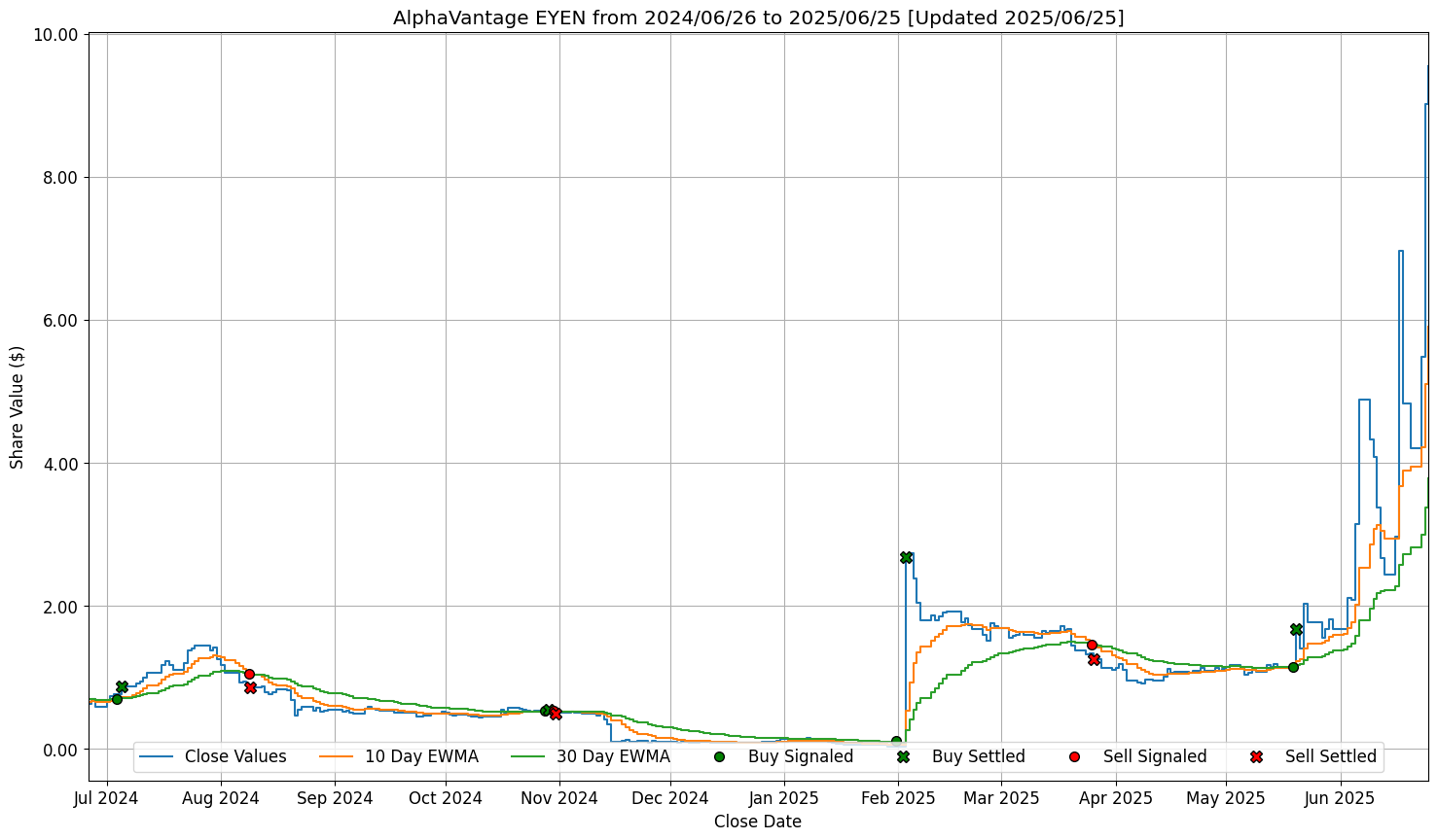 Thank you for using Alpha Vantage! Please consider spreading out your free API requests more sparingly. You may subscribe to any of the premium plans at https://www.alphavantage.co/premium/ to lift the free key rate limit (25 requests per day) and instantly unlock all premium endpoints Could not retrieve data from remote server for EYEN.