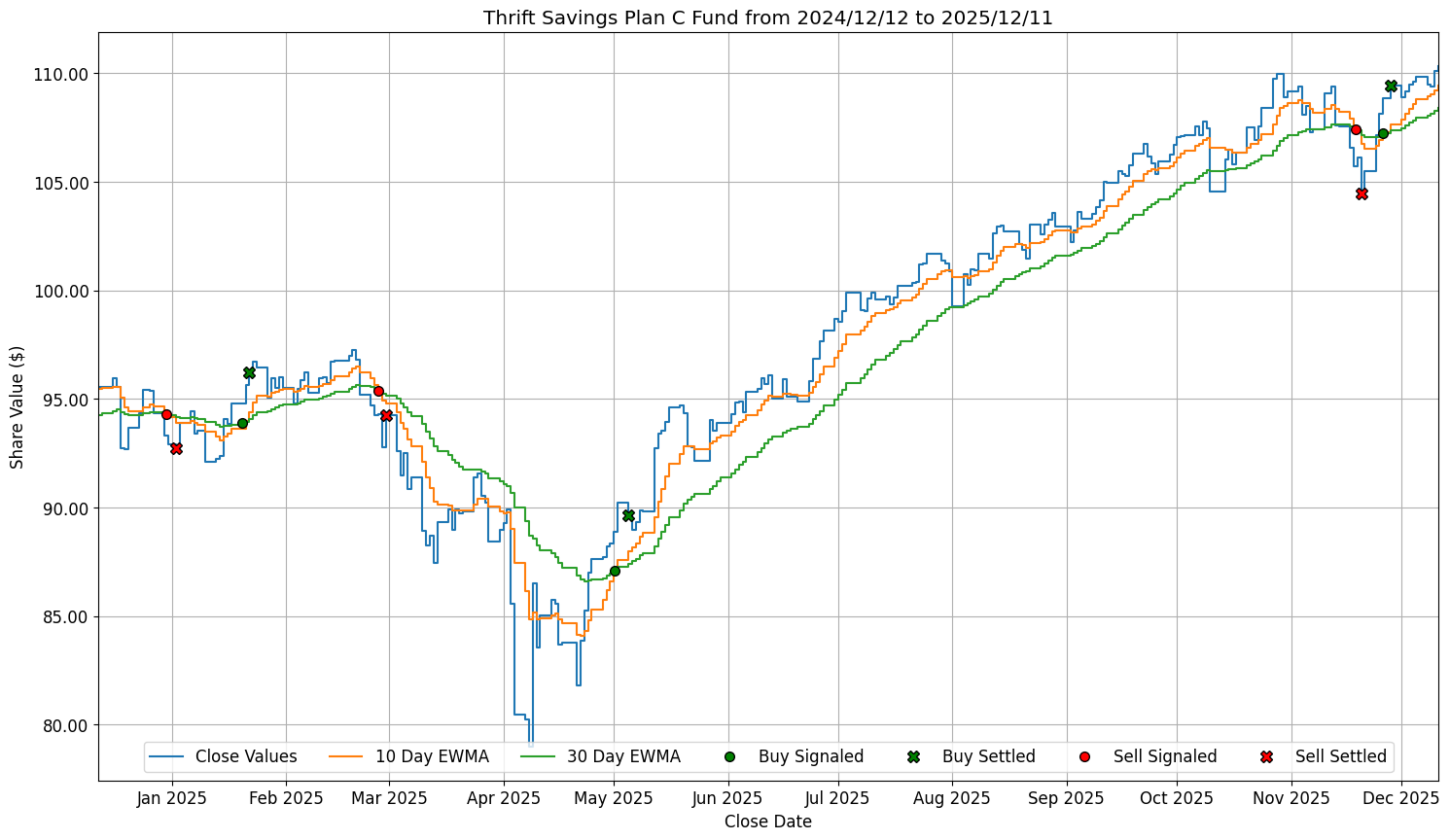 C fund price as of 2025/12/10: $110.11 C fund latest crossover: B 2025/11/26 ( 10|15 days ago) @ $107.23 C fund recent performance: 01 day: $109.36 +$0.74 +0.68% 05 day: $109.48 +$0.63 +0.57% 20 day: $109.09 +$1.02 +0.93% 60 day: $104.97 +$5.14 +4.89% C fund full performance: (assumes 1 day trade delay) Invested: +$14.04 +14.61% Signaled: +$10.94 +11.39% Variance: -$3.09 -3.22%