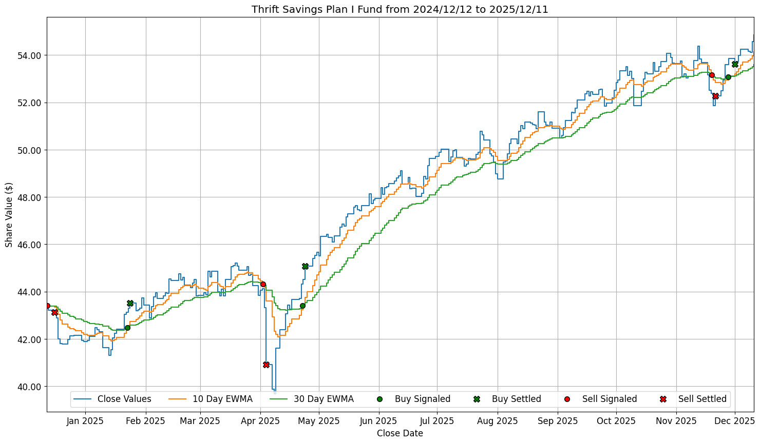 I fund price as of 2025/12/10: $54.56 I fund latest crossover: B 2025/11/28 ( 9|13 days ago) @ $53.08 I fund recent performance: 01 day: $54.13 +$0.44 +0.81% 05 day: $53.99 +$0.57 +1.06% 20 day: $53.77 +$0.79 +1.47% 60 day: $52.09 +$2.47 +4.75% I fund full performance: (assumes 1 day trade delay) Invested: +$10.95 +25.10% Signaled: +$7.37 +16.89% Variance: -$3.58 -8.21%